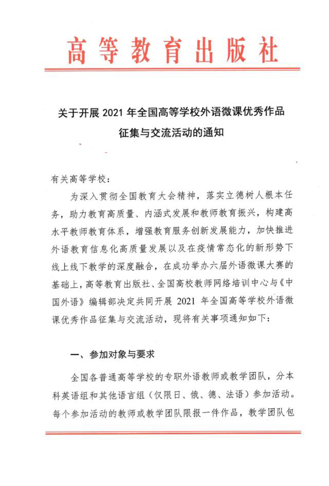 转发高等教育出版社《关于开展2021年全国高等学校外语微课优秀作品征集与交流活动的通知》