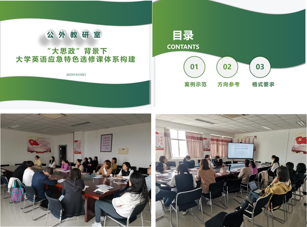 会议中赵娟、赵楠楠两位教师就新开设的大学英语特色选修课《应急英语阅读与思辨》、《学术英语视听说》中的应急特色教学案例开展公开课,为进一步贯彻外语课程思政育人、对接行业需求育人、善用教育技术育人的“三育人”理念,进一步群策群力开发应急特色教学资源提供了思路和借鉴,教研室教师围绕公开课内容展开积极讨论。