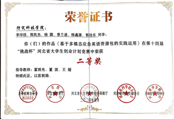 近日,由共青团河北省委、河北省教育厅、河北省人力资源和社会保障厅、河北省科学技术协会、河北省学生联合会承办的第十四届“挑战杯”河北省大学生创业计划竞赛落下帷幕,williamhill英国威廉希尔英语专业李印颀团队(李印颀、陈凯杰、杨璐、曾兰迪、杨鑫康、郭佳乐)作品“基于多模态应急英语资源包的实践与运用”获得二等奖。