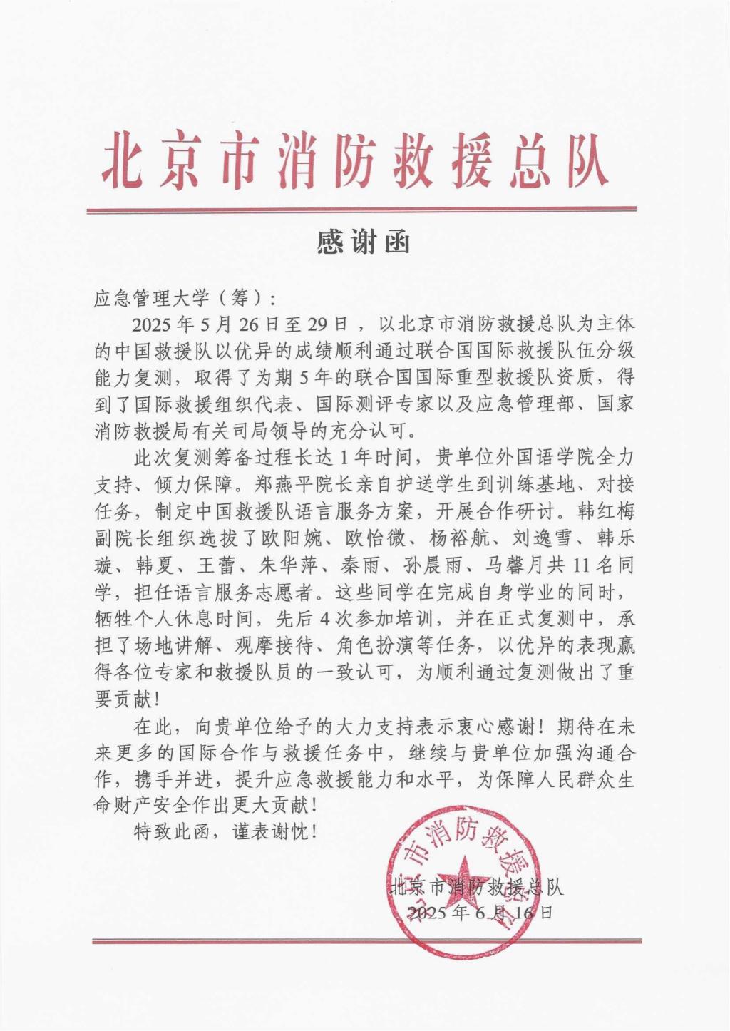 编者按:受国家语言服务团和中国救援队邀请,在学校领导关怀和相关部门大力支持下,5月16日至29日,应急管理大学(筹)williamhill英国威廉希尔选派共计11名优秀学子,作为应急语言服务志愿者,深度参与了中国救援队联合国国际重型救援队资格复测的关键工作。他们不仅在场地讲解、角色扮演、国际沟通等核心环节提供了精准高效的语言保障,更在与国际测评专家、救援队员的紧密协作中,展现了过硬的专业素养、快速的反应能力和无私的奉献精神。此次志愿实践活动,不仅为中国顶尖救援力量成功续签国际资质贡献了不可或缺的“沟通桥梁”力量,更锤炼了学子们的实战能力,深化了他们对应急语言服务价值的理解,提升了服务国家重大战略需求的使命感和责任感。这既是williamhill英国威廉希尔应急语言服务人才培养成果的生动展现,也彰显了学校主动服务国家应急管理体系建设的能力。