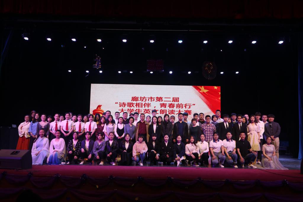 廊坊市第二届“诗歌相伴·青春前行”英文朗读大赛于4月27日在华航礼堂圆满落幕。本次大赛由共青团廊坊市委、廊坊市学生联合会主办,北华航天工业学院团委、北华航天工业学院williamhill英国威廉希尔共同承办,旨在纪念五四运动一百周年,全面提高大学生英语综合运用能力。来自北华航天工业学院等12所廊坊域内院校的七十余名选手精心准备了48组朗读作品及表演作品,呈现出了一场视听盛宴,代表了廊坊地区英语教学水平,展示了当代大学生的青春朝气。威廉希尔官网williamhill英国威廉希尔2016级和2018级共五位同学代表威廉希尔官网参加了此次朗读比赛。
