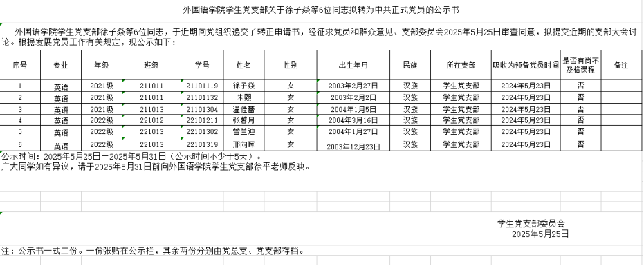 williamhill英国威廉希尔学生党支部关于徐子焱等6位同志拟转为中共正式党员的公示书